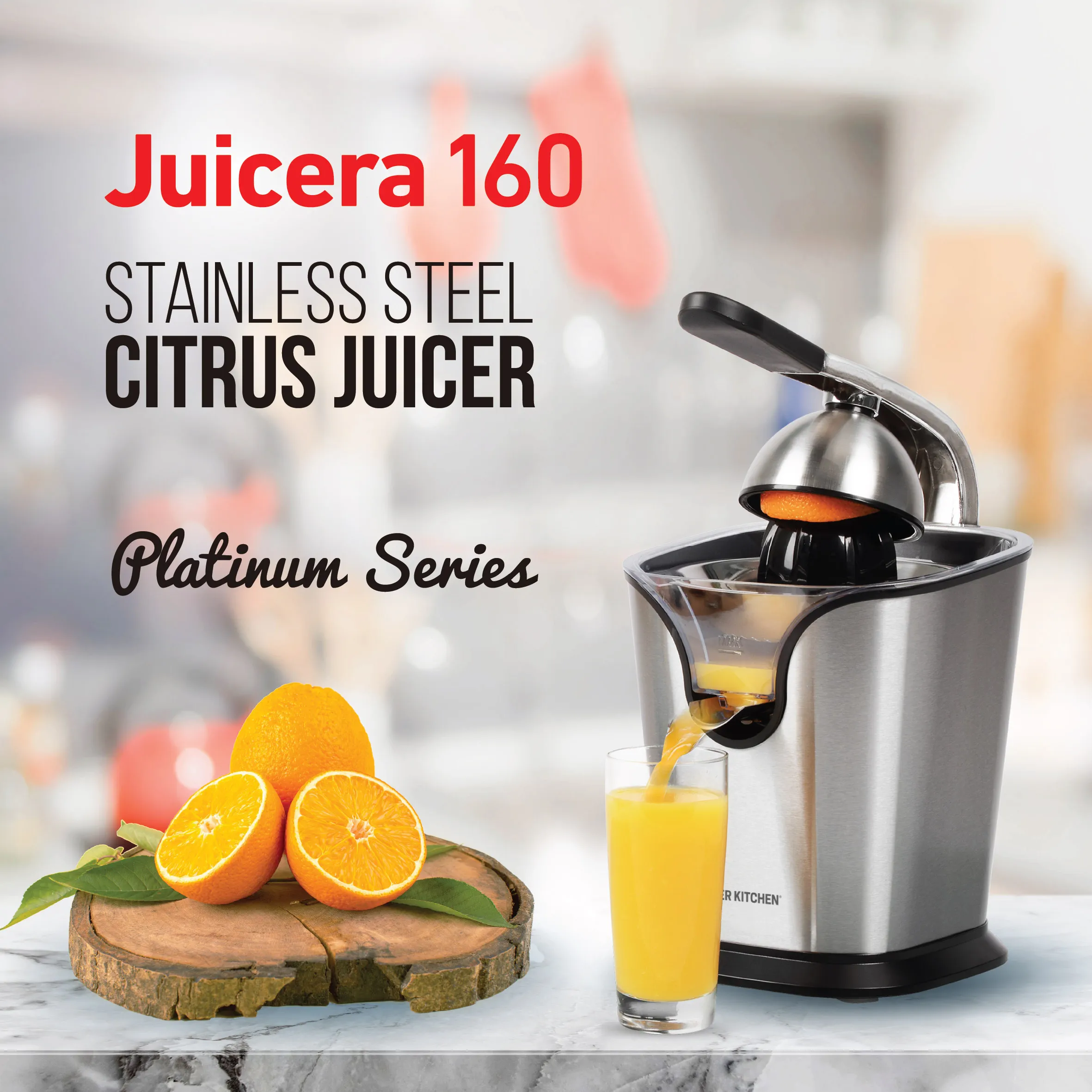 Powerful: with its powerful and durable 160W motor, is extremely quiet and very effective, oranges, lemons and the like, squeezed optimally, the beautiful timeless design fits perfectly in your kitchen